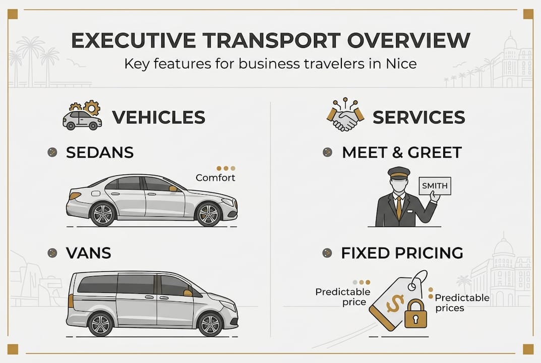 Executive transport costs 40 to 60 percent more than taxis or rideshares but eliminates surge pricing and guarantees luxury vehicles, professional chauffeurs, and fixed transparent rates. Typical airport transfer Nice routes range from €90 to €230 depending on destination and vehicle type.