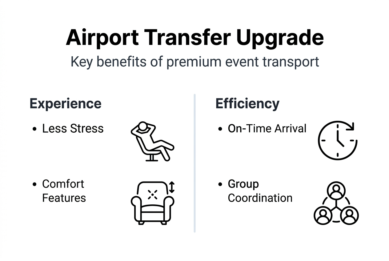 | Stress reduction | Premium event transport cuts travel anxiety by 30% while increasing productivity by 15% for business travelers |